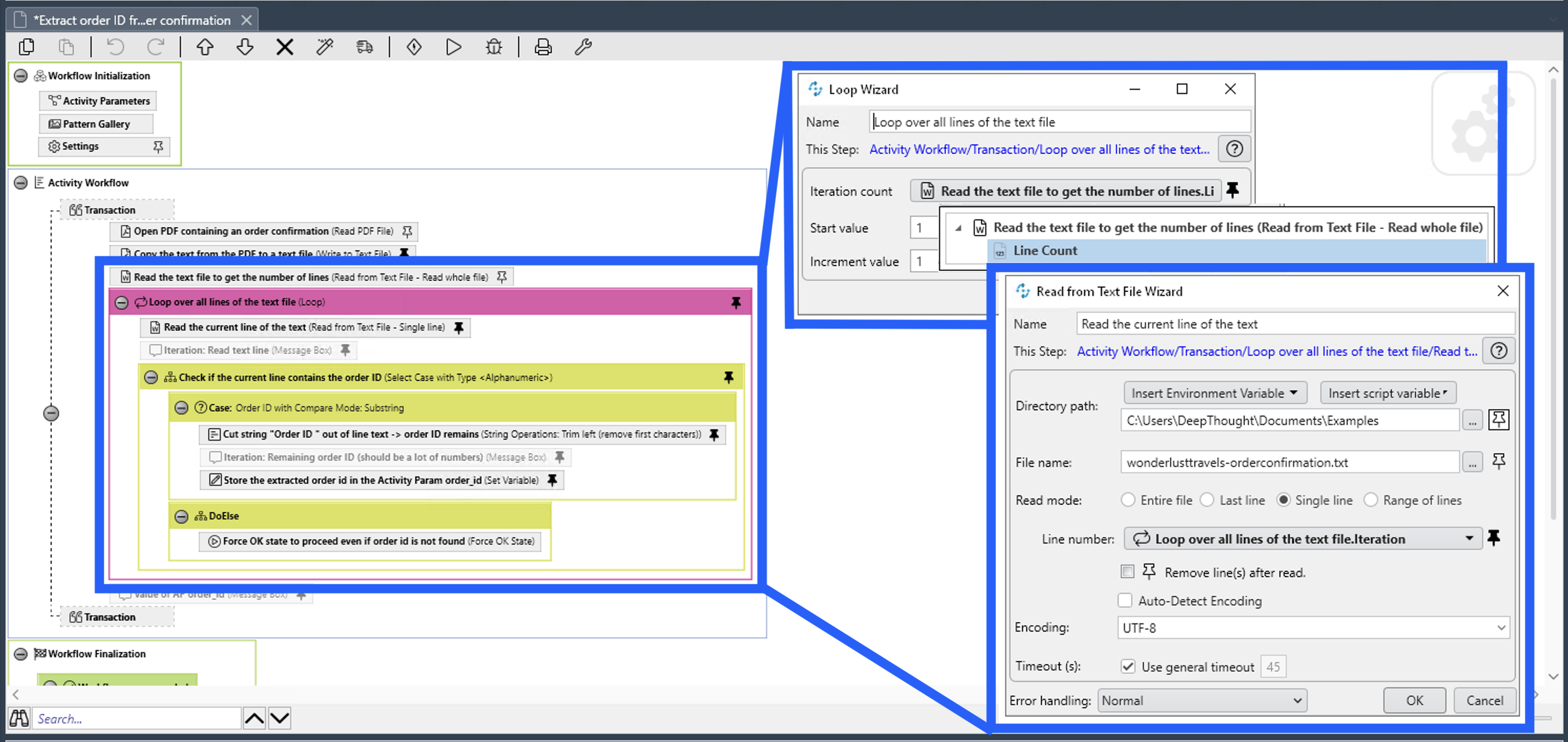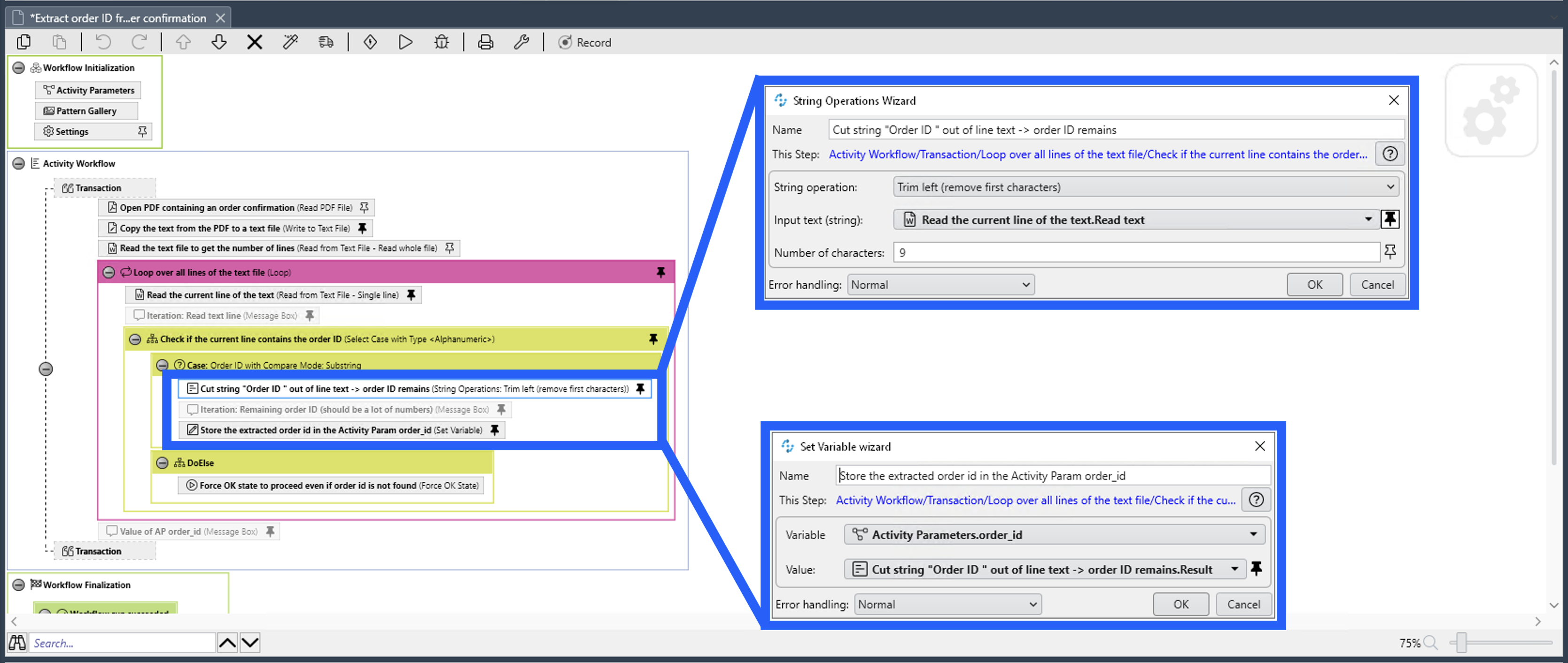 Because you know that the order ID is written after the text Order ID, you can remove these first nine characters from the current line (which contains the substring Order ID) by using the Trim left (remove first characters) operations of the String Operations action step. The rest of the string is the order ID. You store it in the Activity Parameter with the same name by using the result of the string operation as a Pin Variable in the Set Variable action step.